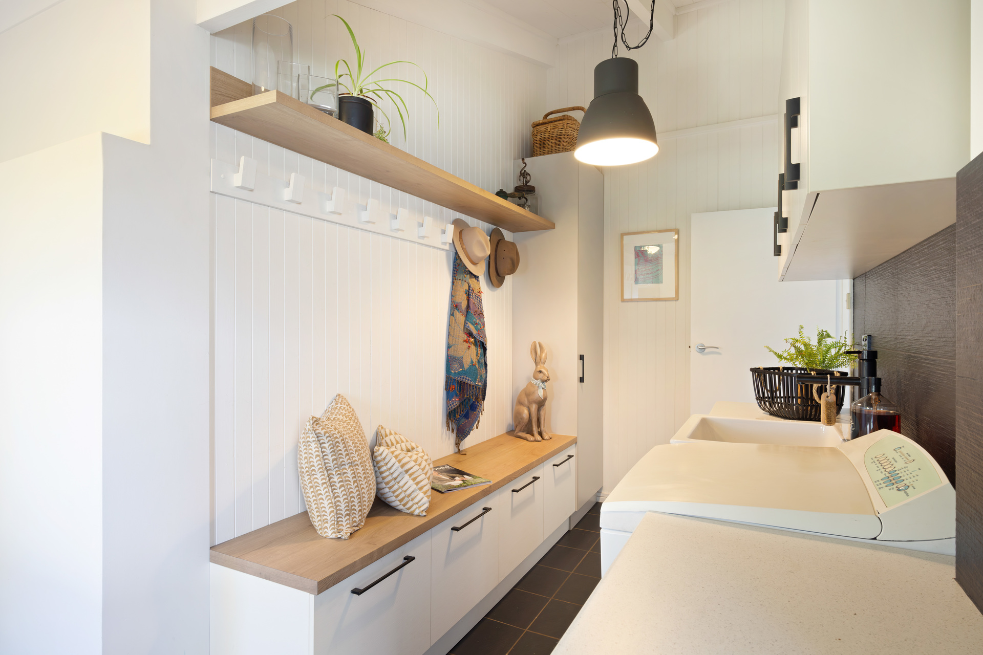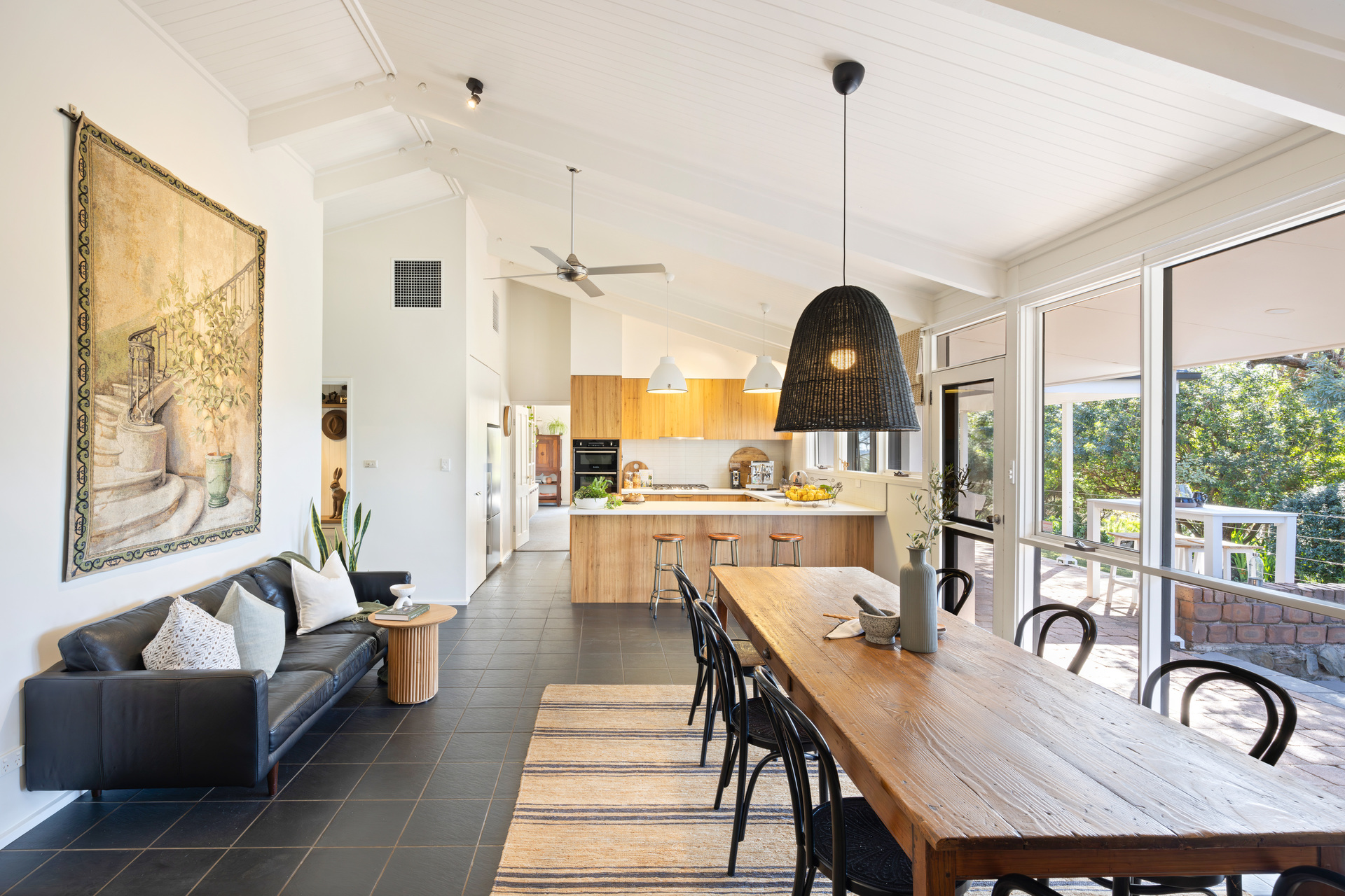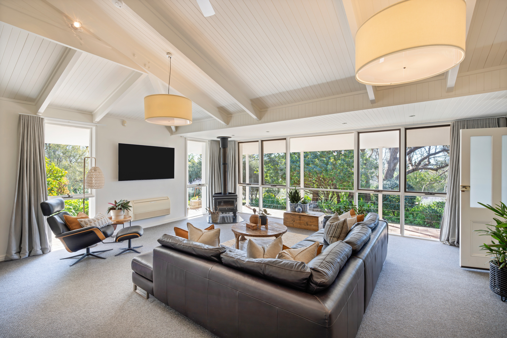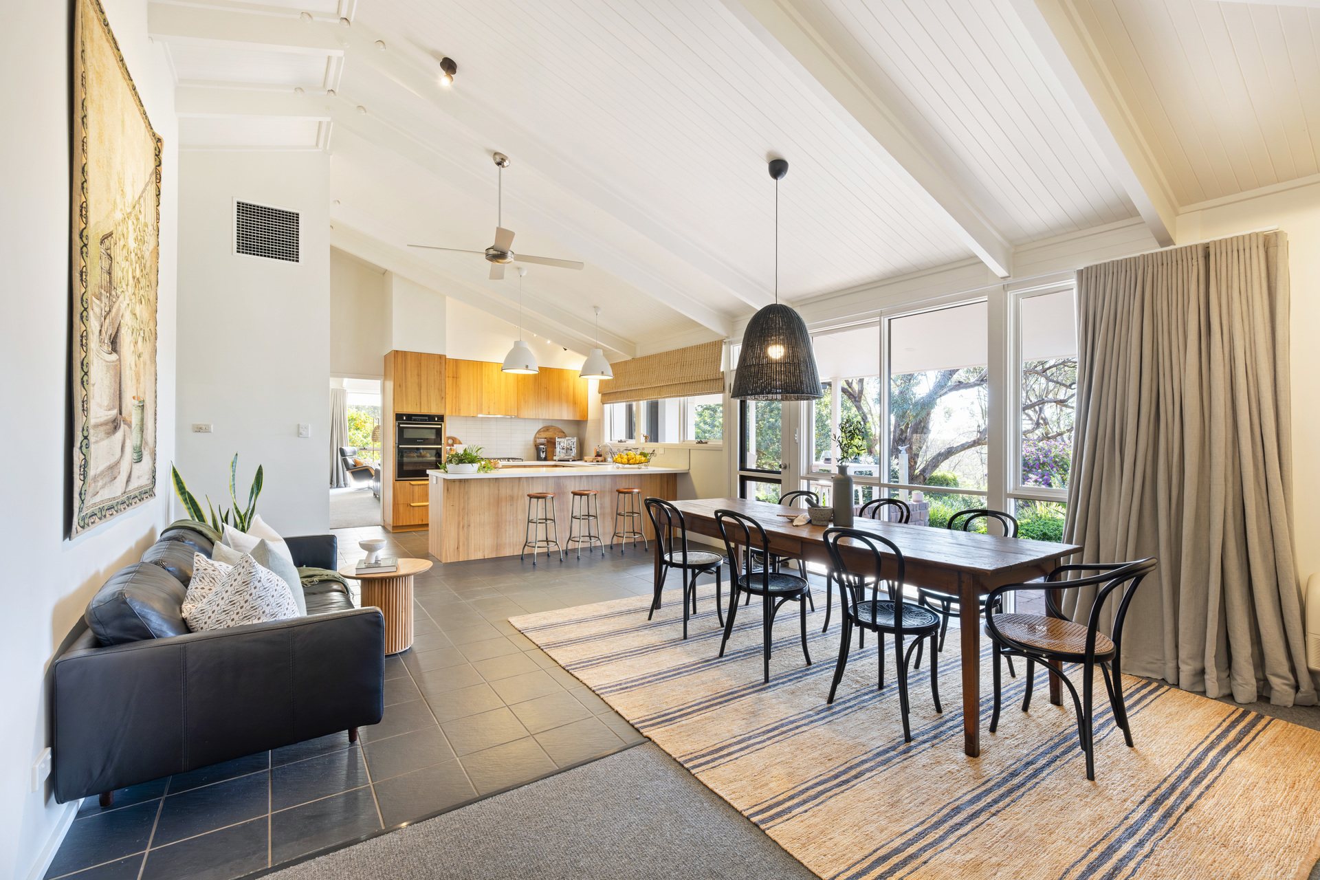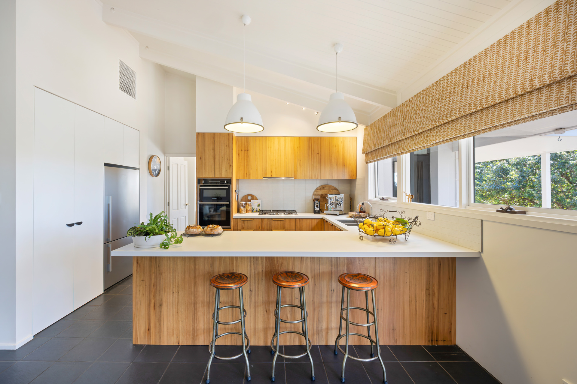 It feels good because this extended return verandah home looks good, drawing you to the central family room headlined by its raked timber-clad ceilings and a searingly stylish open-plan kitchen with stone composite tops, Ariston appliances, Blackbutt timber cabinetry and bundles of storage.