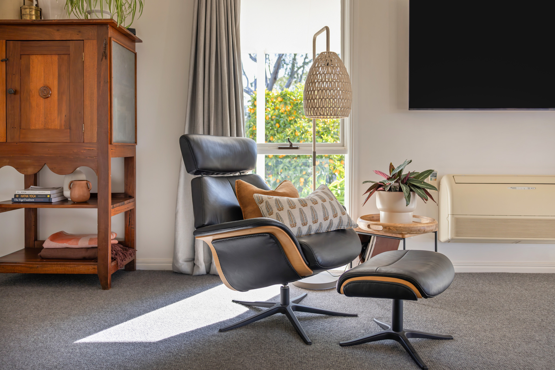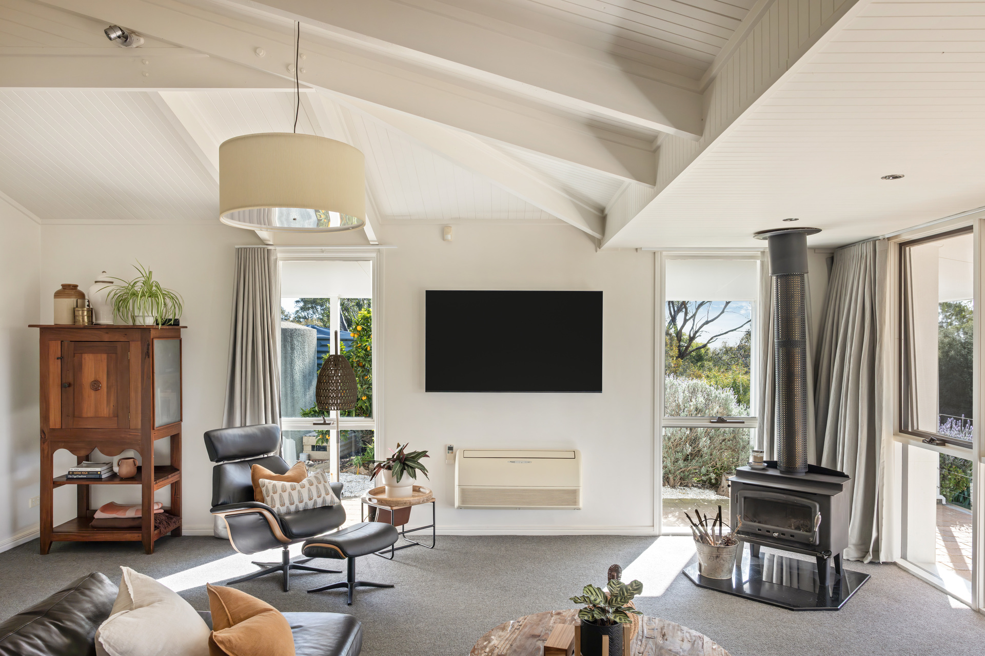 - Evaporative ducted cooling, split r/c and cosy combustion fireplace