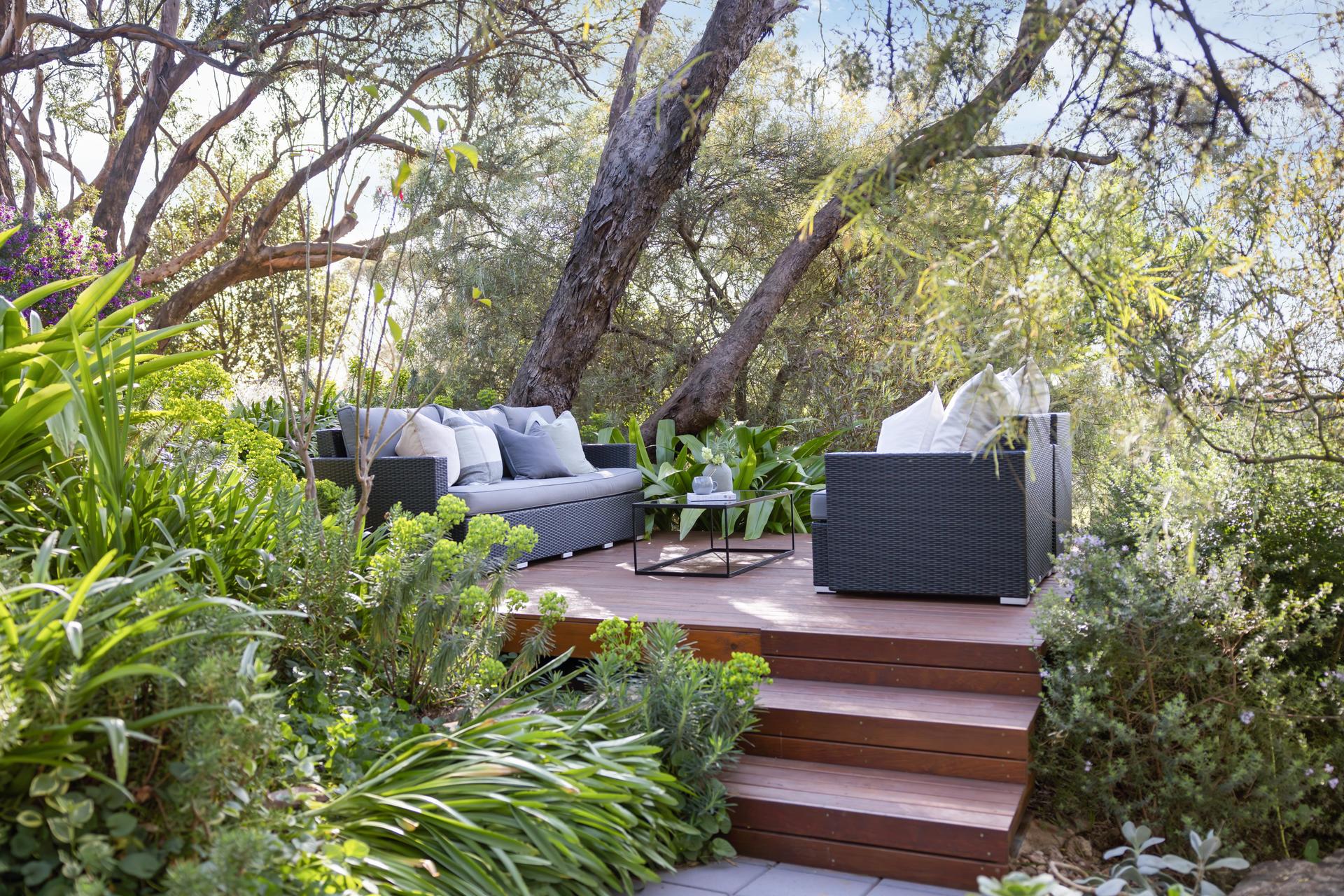 - Custom deck-platform built into the garden setting